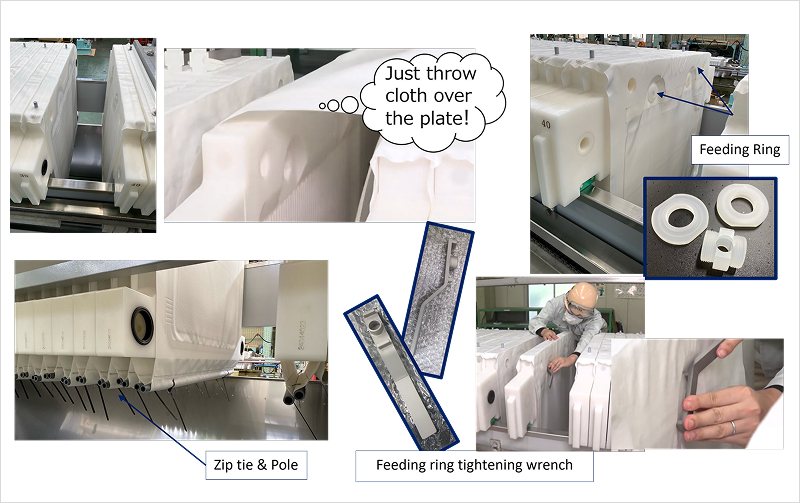 - Filter Cloth Replacement: Featuring an over-the-plate drape design, filter cloths are hung over the top of the plate and secured with side-mounted feed rings. On standard plates, the cloth can be replaced by removing the feed rings and simply pulling it upward.