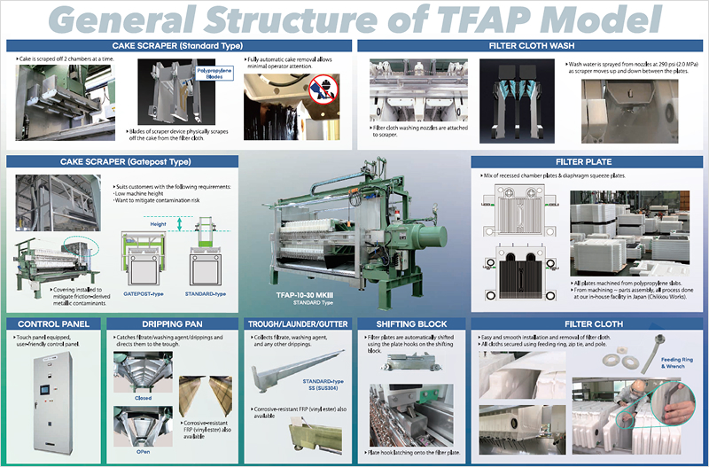 The TFAP series features an easy-to-replace design for filter cloths and diaphragm sheets, combined with intuitive touch panel operation for a seamless user experience.