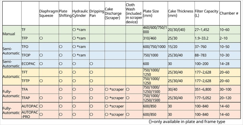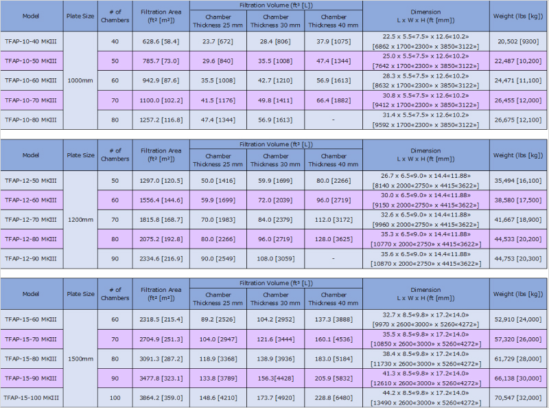 The TFAP series offers a standardized range of specifications, combining various frame sizes (e.g., 7/10/12/15 Type) with different numbers of chambers. Three chamber thicknesses are available—25, 30, and 40 mm—to suit your process requirements. Detailed dimensions and weights can be found in the specification table.