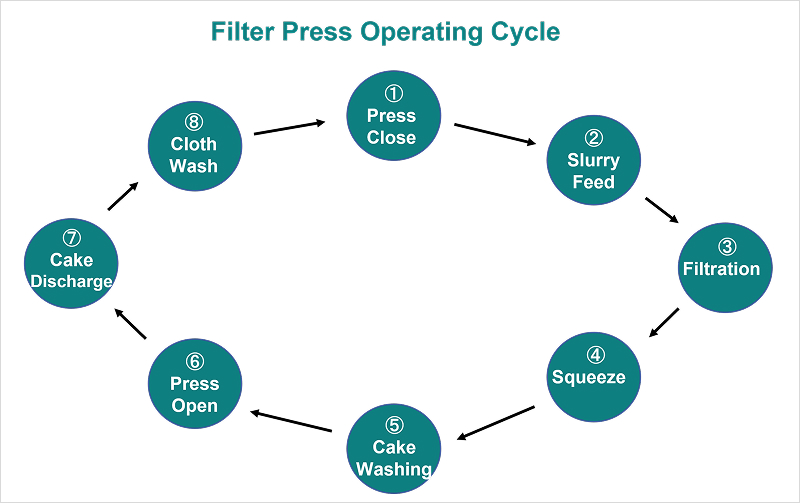 Filter presses, including plate and frame types, generally operate in batch cycles. A typical sequence is: