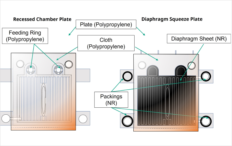 In the plate and frame configuration, plates and frames are alternately arranged and clamped together, with the frame thickness defining the filter chamber and cake thickness. When slurry is pumped into the press, solids accumulate on the filter cloth to form a cake, while the liquid(filtrate) passes through the cloth and is discharged. A structural characteristic of this system is the relative ease with which cake thickness can be adjusted by changing the frame thickness.