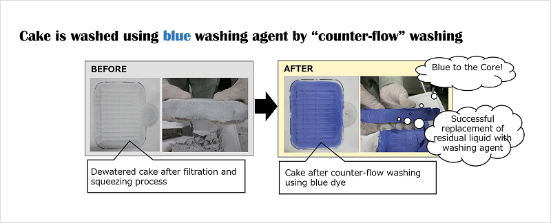 Fig.3: Counter-flow cake washing result (blue dye test) — washing agent distributes evenly through the entire cake, confirming thorough residual liquid replacement