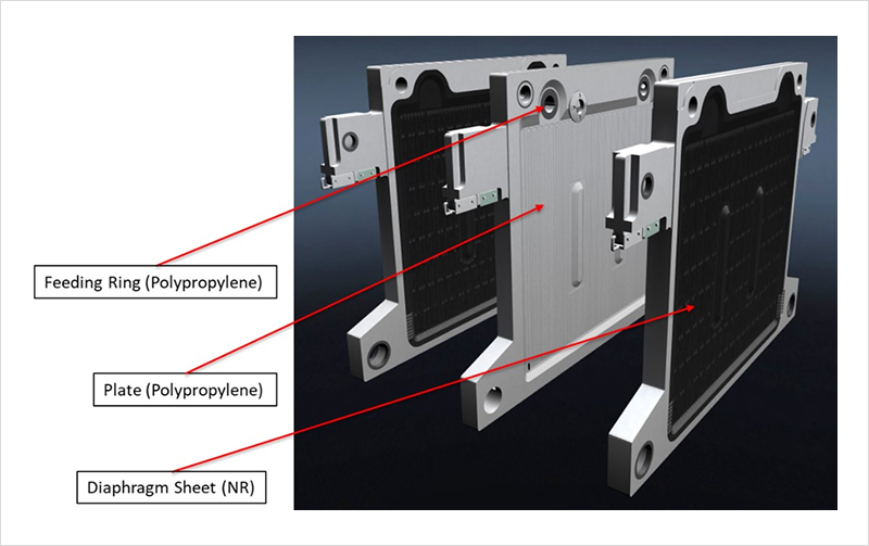 Fig.2: Metal-free wetted parts — polypropylene plate, feeding ring, and NR diaphragm sheet for corrosive slurry applications