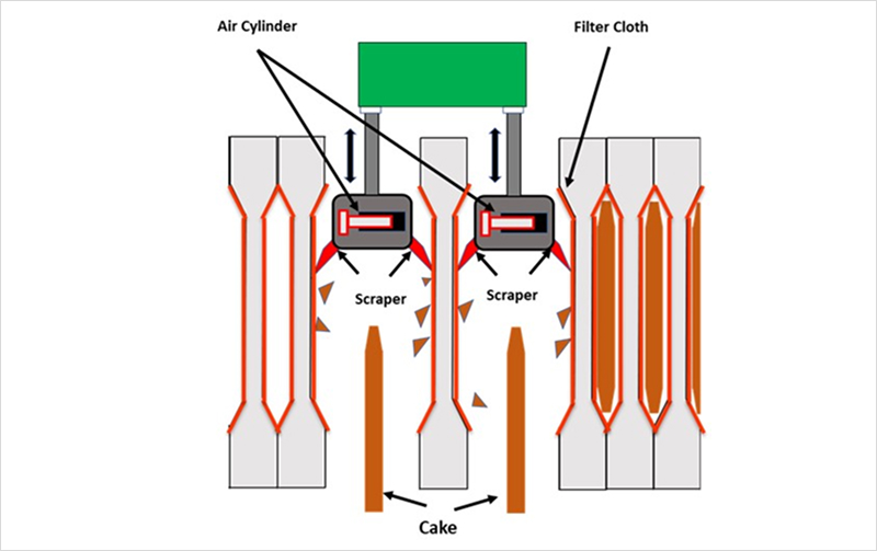 Fig.4: Scraper cake discharge mechanism — polypropylene blades physically remove cake from the filter cloth, reducing manual intervention for sticky cakes